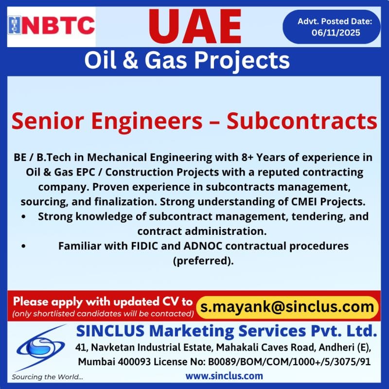 NBTC is hiring experienced Senior Engineers specialized in Subcontracts for Oil & Gas projects in the UAE.