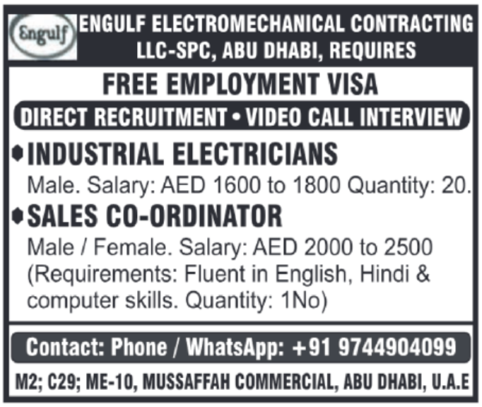 Engulf Electromechanical Contracting LLC-SPC, Abu Dhabi, is conducting direct recruitment with a free employment visa and video call interviews.