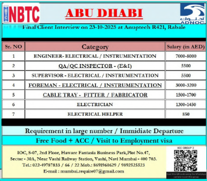 NBTC is hiring for ADNOC projects in Abu Dhabi. Engineers, Supervisors, Electricians & Helpers required. Interview on 23-10-2025. Free food & accommodation provided.