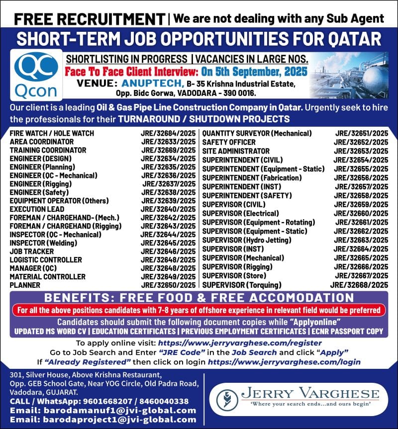 Supervisors (Electrical, Civil, Store, Rigging, Torquing, Hydro Jetting)